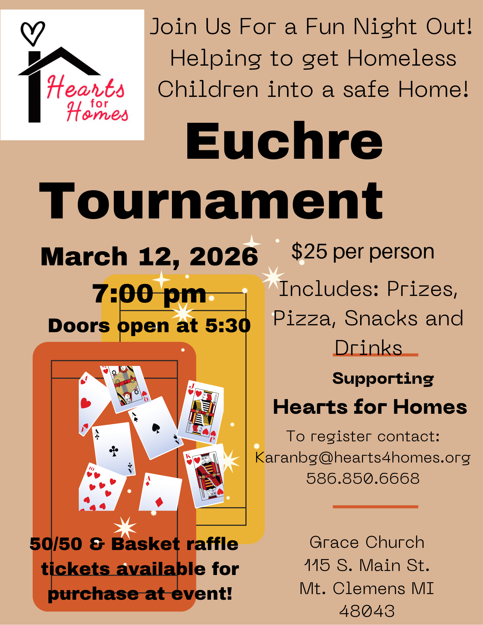 Hearts for Homes will be hosting a Euchre Tournament! March 12, 2026